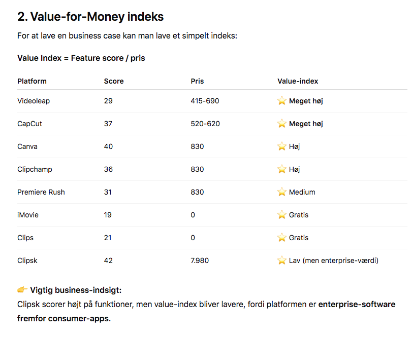 Clipsk scorer højt på funktioner, men value-index bliver lavere, fordi platformen er enterprise-software fremfor consumer-apps.